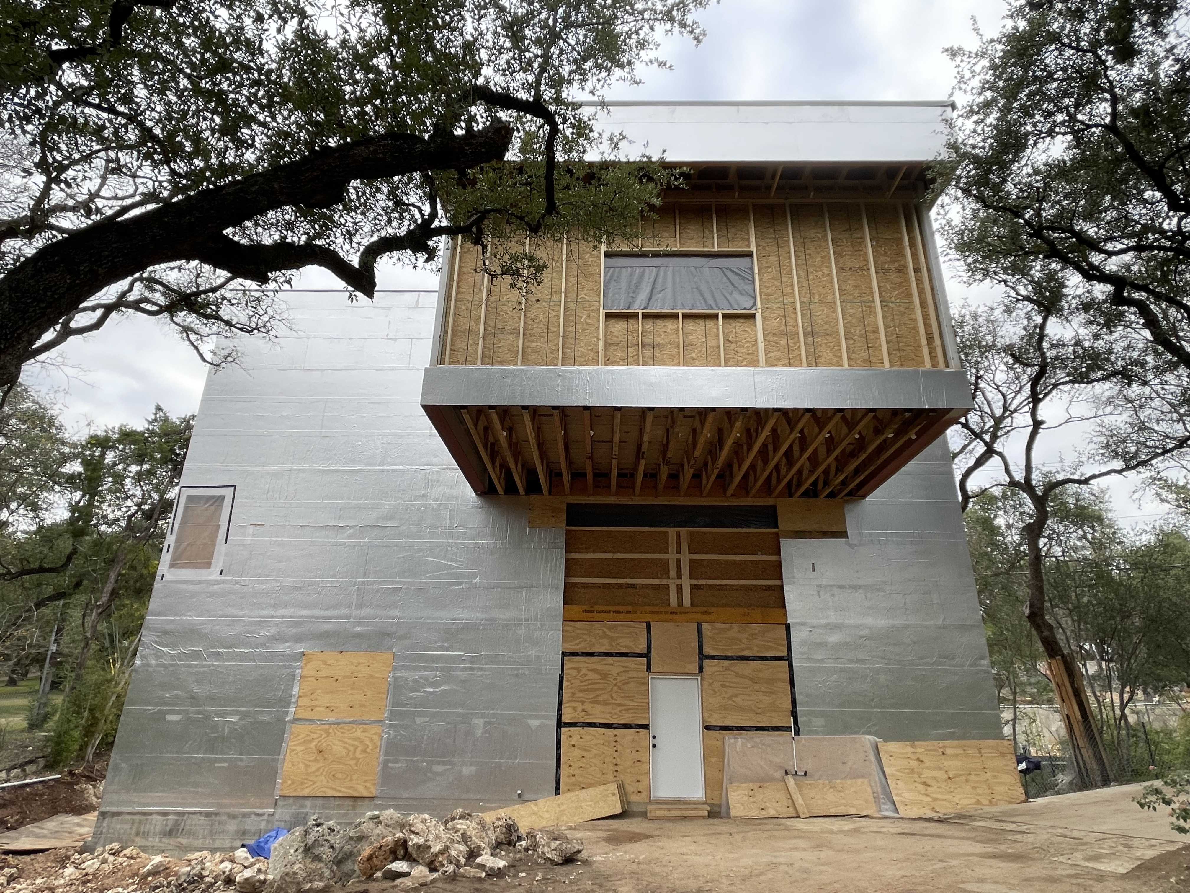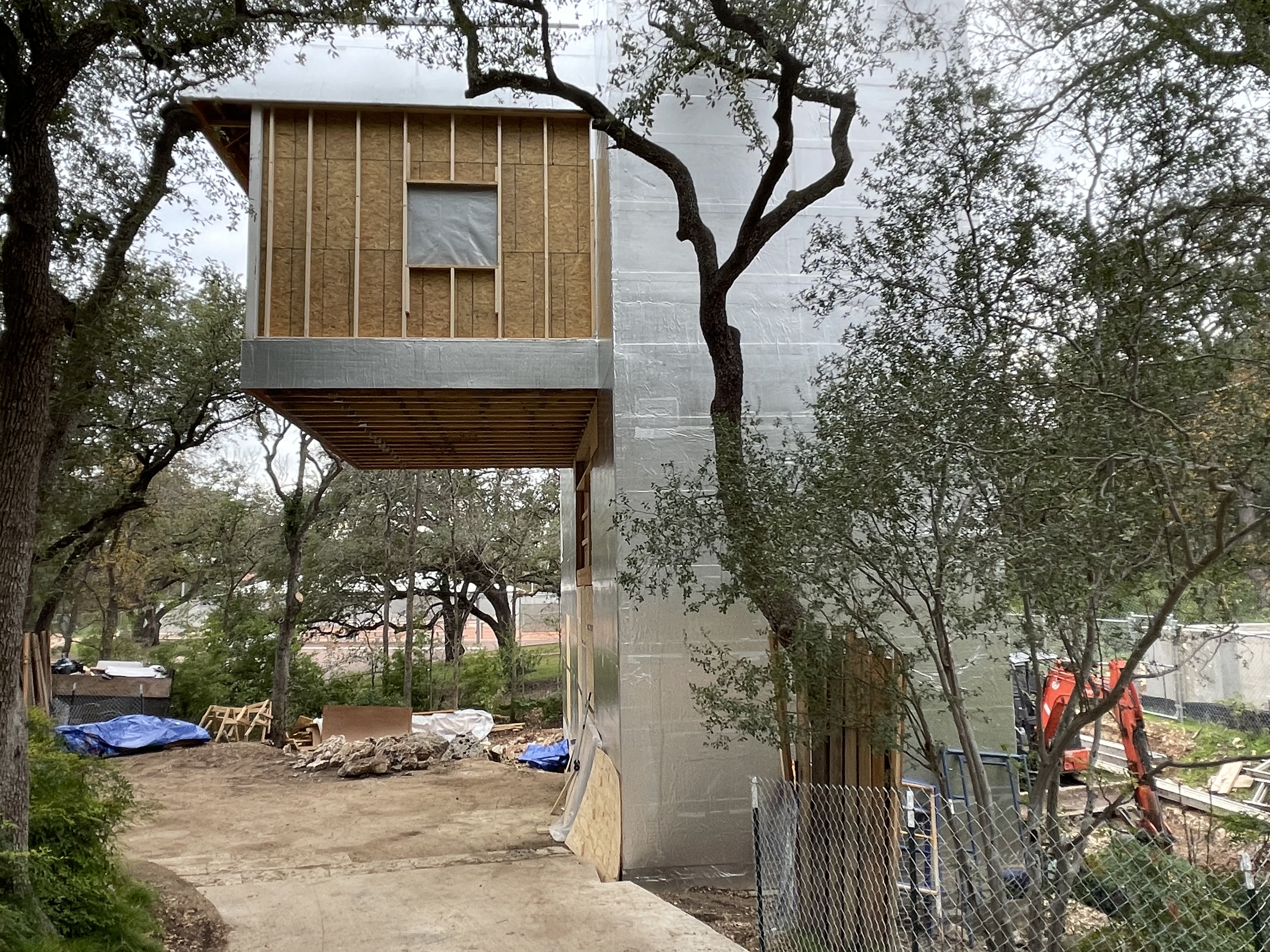Studio construction is going well, and despite a potential delay of windows, it continues apace, still looking like completion around April. With framing and sheathing pretty much done, and electrical and plumbing roughed-in, we are beginning to get a stronger sense of the spaces, how we’ll organize them, and what working in them will look like. While the building appears compact from the outside, the interior feels quite spacious.