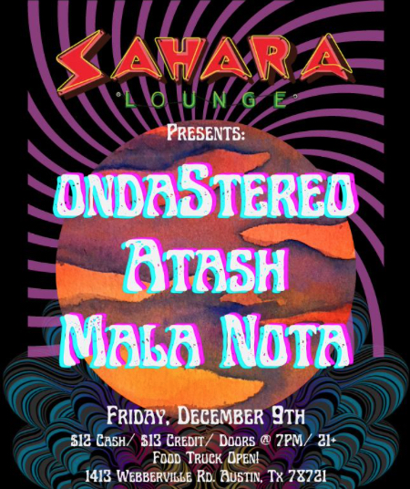 Sahara Lounge 1413 Webberville Road Austin, TX 78721 (512) 927-0700 8:30 - Onda Stereo 10:00 - Atash Midnight - Mala Nota